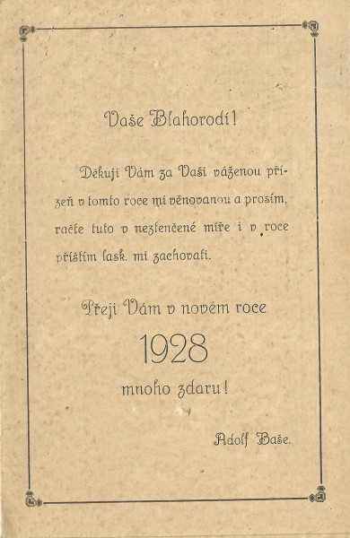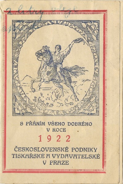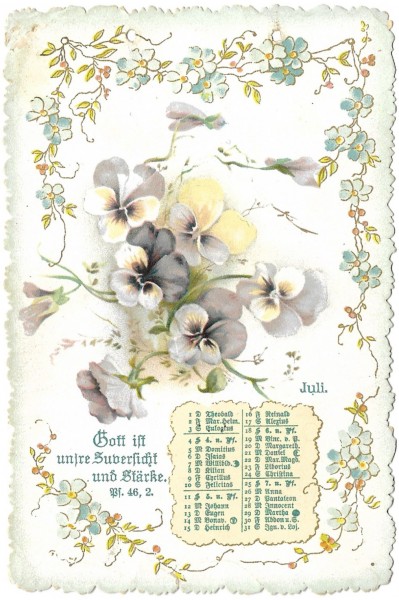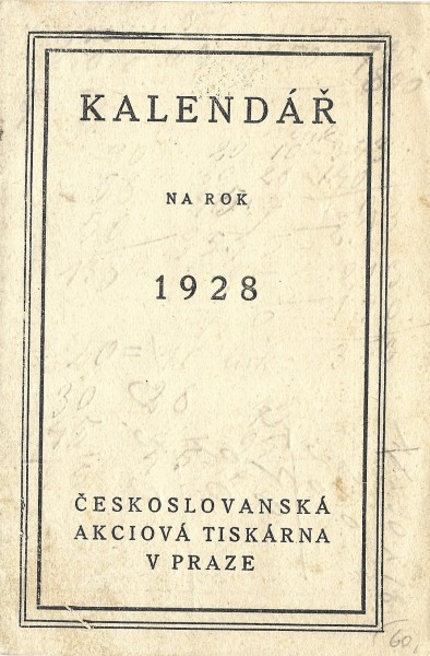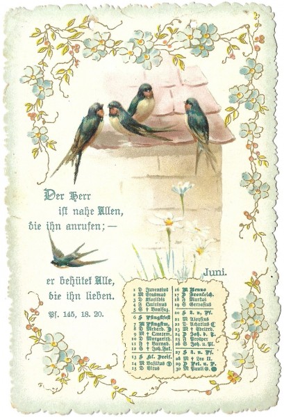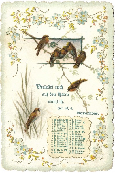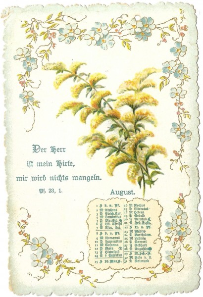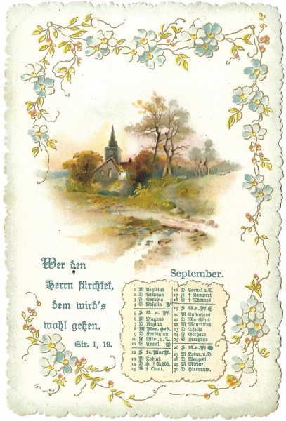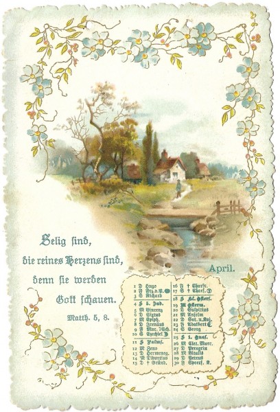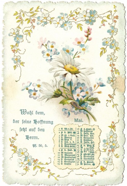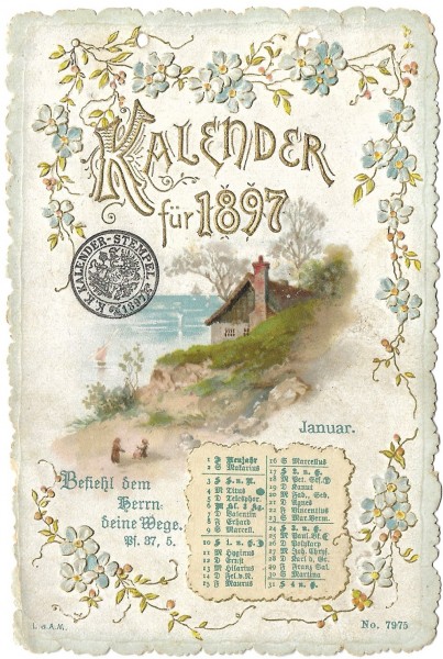 1897 - závěsný otočný kalendář velikosti 83 x 124 mm s biblickými verši v německém jazyce s úředním c. k. razítkem. Má ozdobné okraje a je vlisovaný. Chybí měsíce únor a březen. Kalendář byl věnovaný Hildou v Praze 11. prosince 1896.
